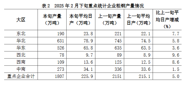 2月下旬六大地區(qū)重點(diǎn)統(tǒng)計(jì)企業(yè)粗鋼日產(chǎn)量較上一旬均有不同程度增長(詳見表2),具體為: